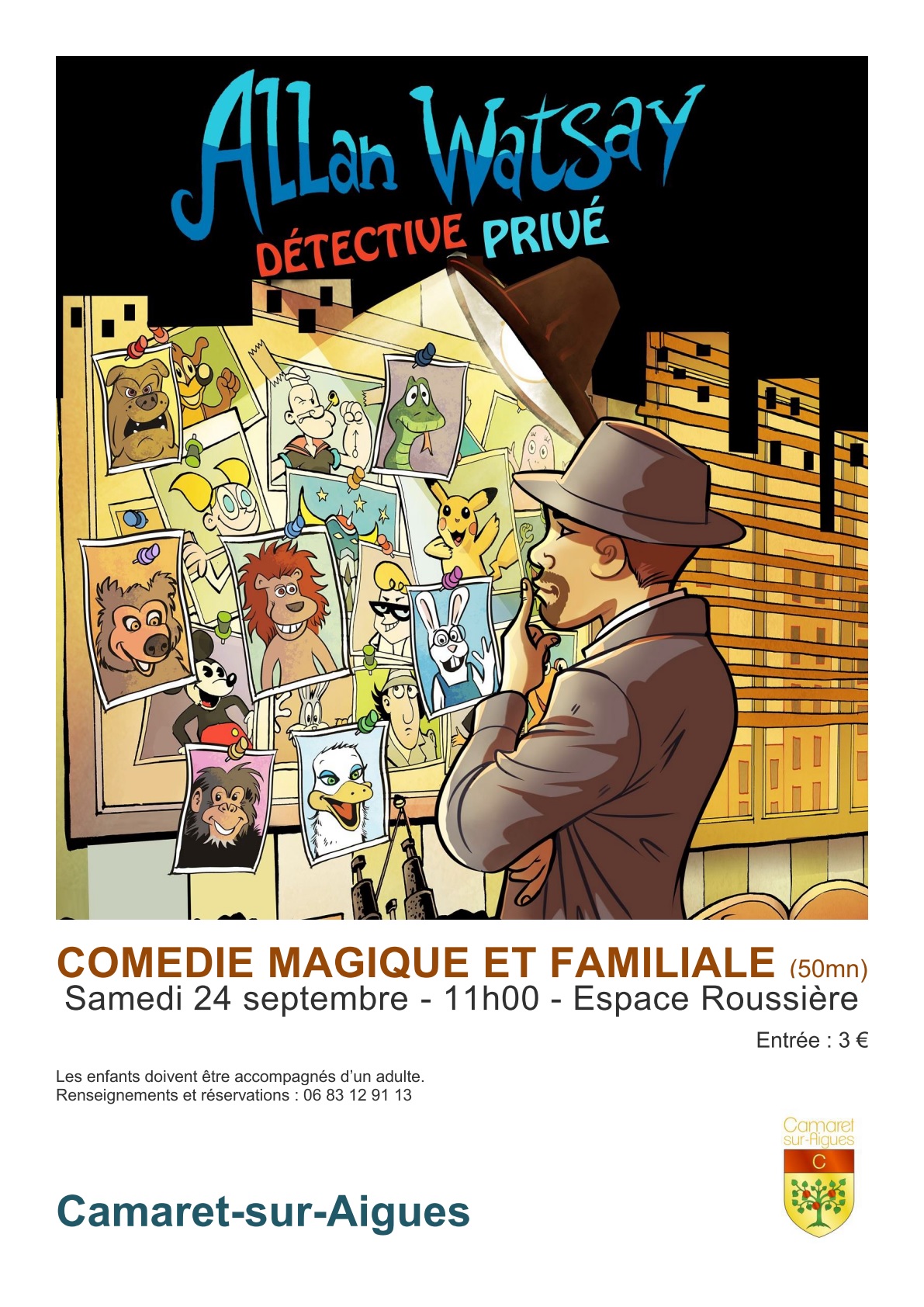 La Cie Sens en Eveil présente la comédie magique et familiale "Allan Watsey, détective privé", à l'espace René Roussière. Quand il apprend que les artistes du cirque Luigi ont disparu, Allan Watsey, détective privé ne peut que se réjouir. Enfin une affaire à la hauteur de sa réputation ! Muni de sa panoplie d’agent secret, il va mener l’enquête avec l’aide des enfants. Mais sera-t-il vraiment l’homme de la situation ? Vous le découvrirez en venant l’aider à résoudre ce mystère. Suspens, humour, rebondissements et magie.