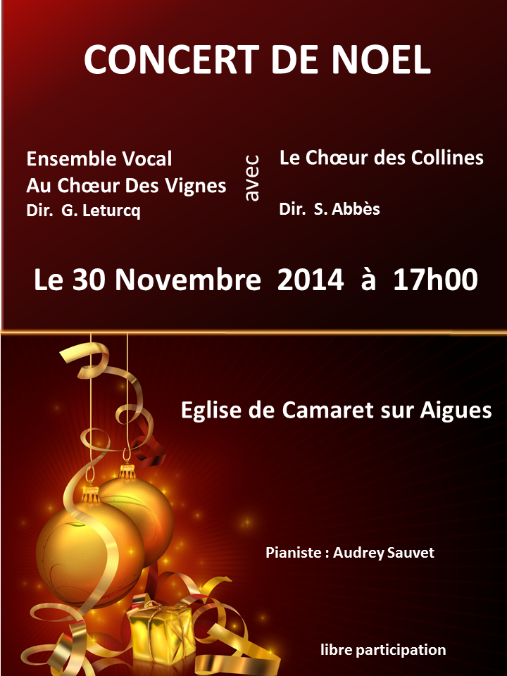 L'ensemble vocal Au Choeur des Vignes vous convie à son traditionnel Concert de Noël le dimanche 30 novembre à 17h à l'église de Camaret.