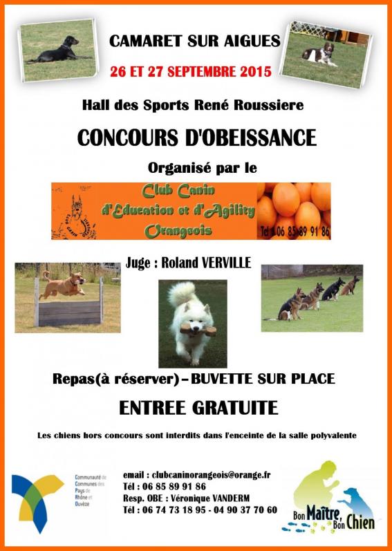 Grand concours d'obéissance organisé par le Club Canin d'Education et d'Agility Orangeois les 26 et 27 septembre à la halle des sports René Roussière. Juge : M. Roland Verville. Repas (à réserver) et buvette sur place.