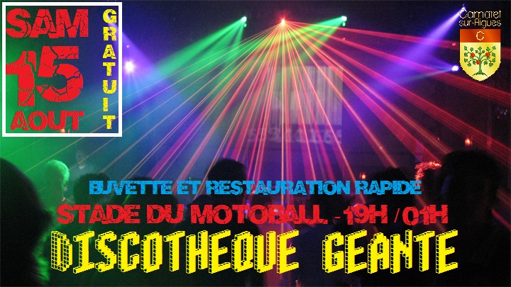 Discothèque géante en plein air de 19h à 1h du matin. Buvette et restauration rapide sur place. Voir le fichier Du 1 au 16 août 2015