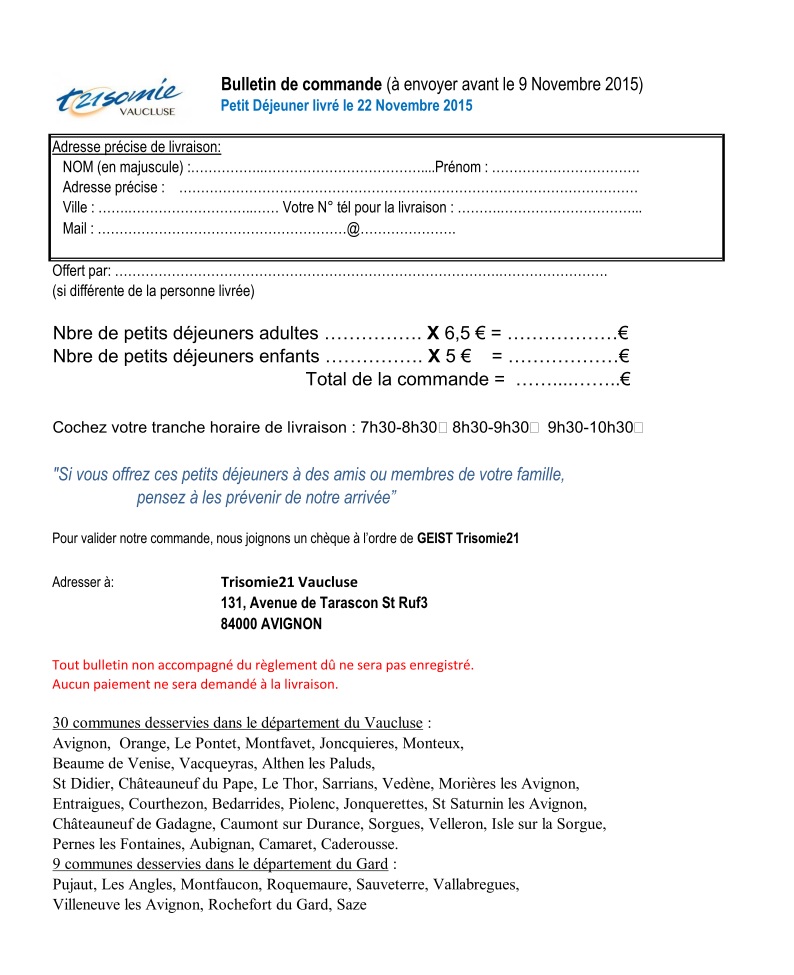 LE PETIT-DEJEUNER SERVI CHEZ VOUS (OU CHEZ DES AMIS) AU PROFIT DES PERSONNES ATTEINTES DE TRISOMIE 21 ET DE LEURS FAMILLES