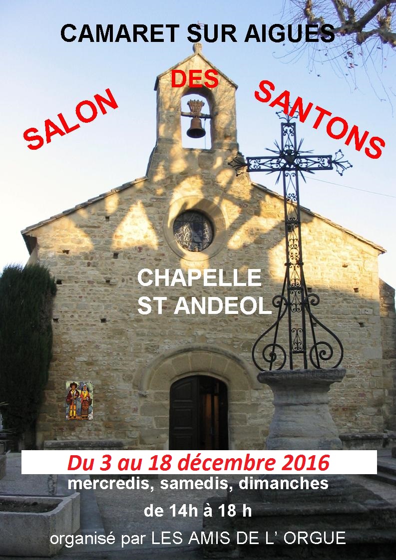 Le traditionnel salon des santons des Amis de l'Orgue et du Patrimoine religieux de Camaret a lieu cette année du 3 au 18 décembre à la chapelle Saint-Andéol. Ouvert les mercredis, samedis et dimanches de 14h à 18h.