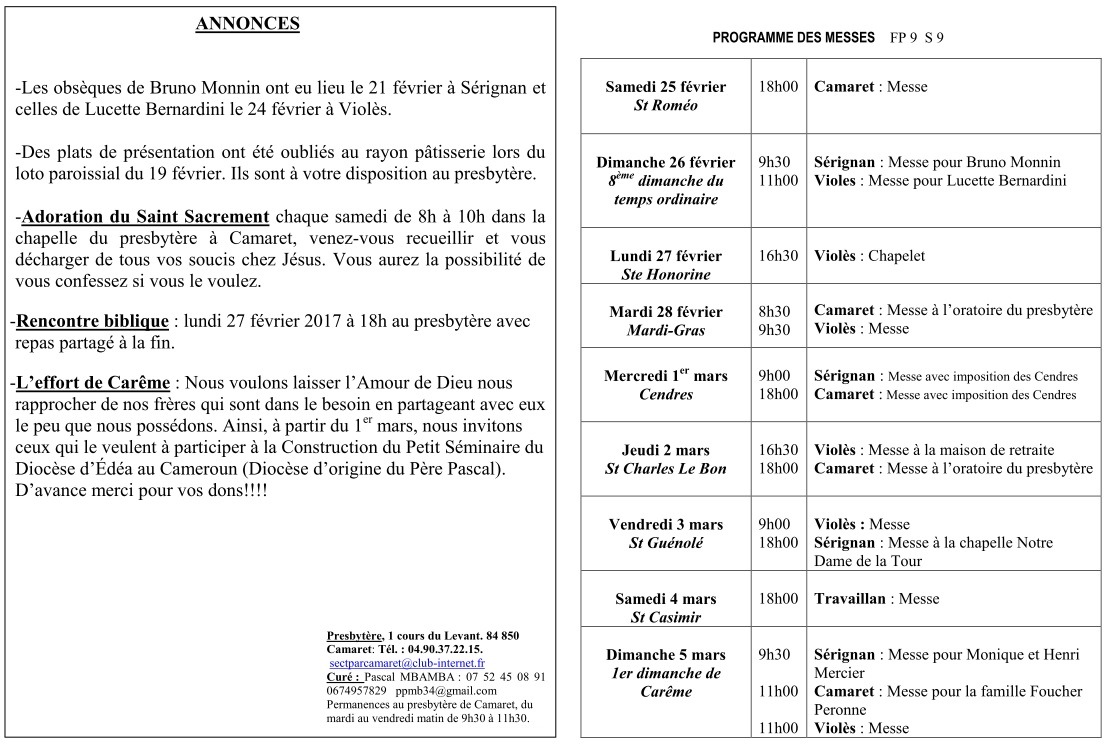 SECTEUR INTER-PAROISSIAL : MESSES ET ANNONCES