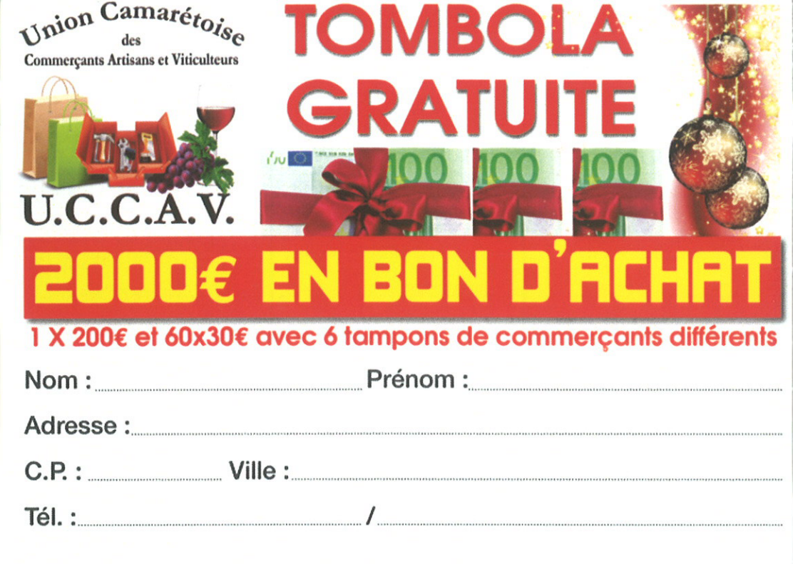 Valable chez tous les commerçants camarétois adhérents de l’UCCAV pour six achats effectués chez six commerçants différents. Date limite de participation : 26 décembre. Tirage de la tombola le 27 décembre.